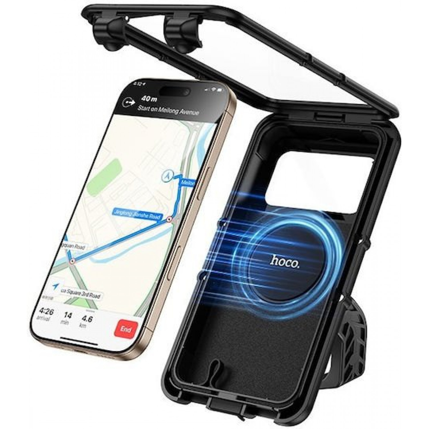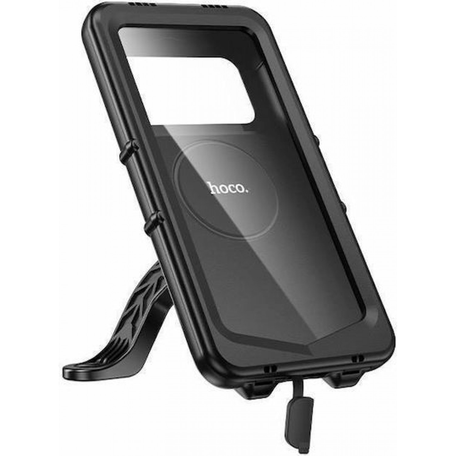 Βάση στήριξης κινητών Κινητού της Hoco για μοτοσυκλέτες. Η βάση διαθέτει υποδοχή για να τοποθετηθεί στο καθρέπτη της μοτοσυκλέτας. Η στήριξη της συσκευής στη βάση γίνεται με ρυθμιζόμενο βραχίονα, επιτρέποντας προσαρμογή σε διαφορετικά μεγέθη συσκευών.